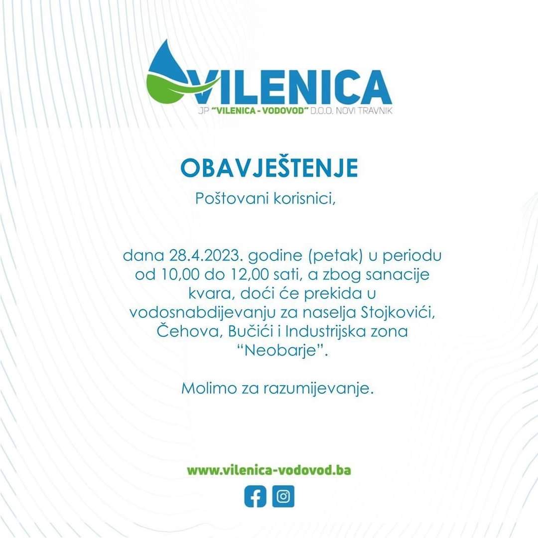 Obavijest iz Vilenice o prestanku vodoopskrbe na području općine Novi Travnik.