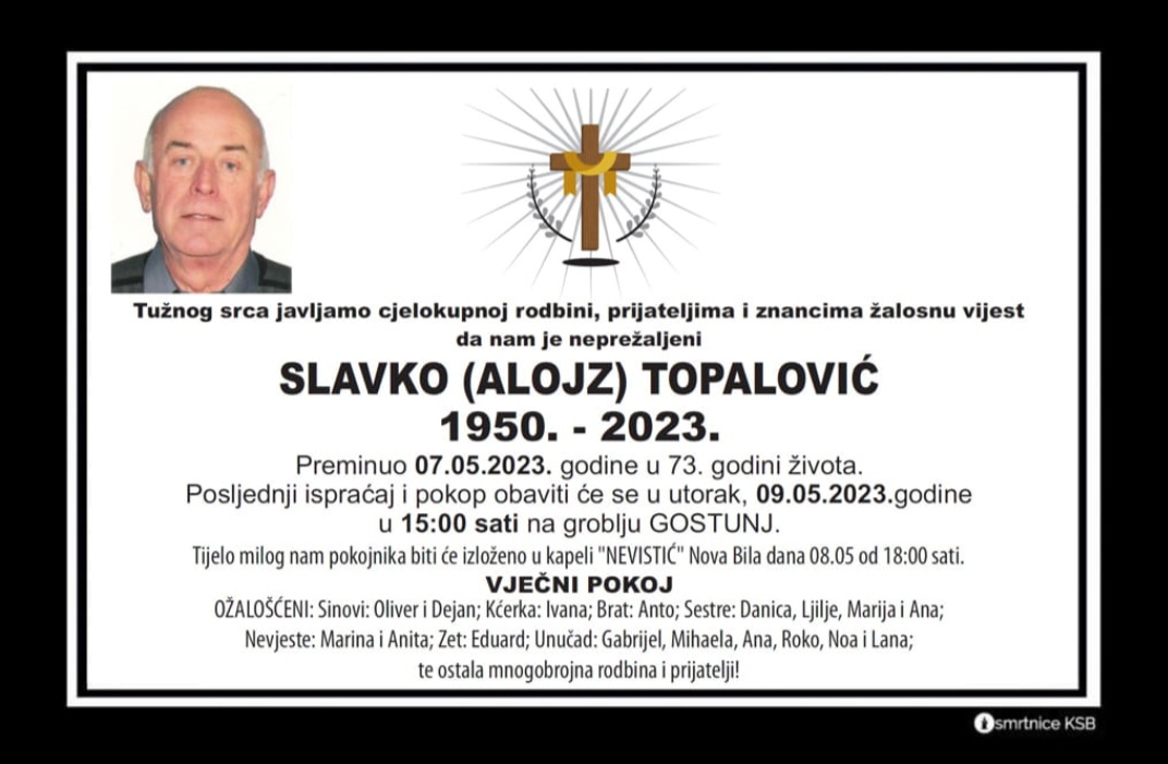 Tužna srca javljamo da nas je u 73.godini života napustio Slavko Topalović. Sahrana i posljednji ispraćaj obavit će se u utorak 09.05.u 15 sati na groblju Gostunj. U ime redakcije