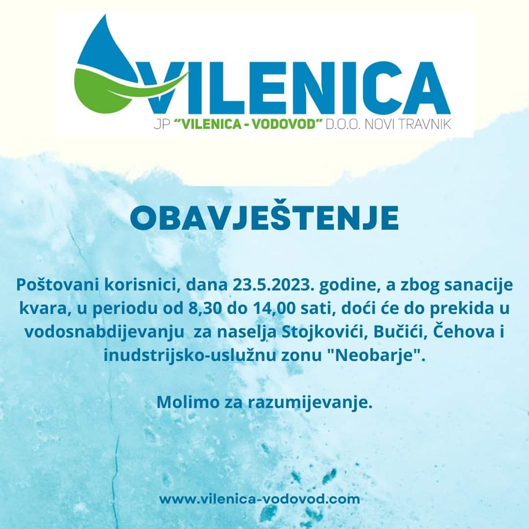 Sutra, 23.svibnja, u razdoblju od 8.30 do 14 sati, pojedina naselja općine Novi Travnik će biti bez vode. Iz Vilenice mole za razumijevanje.