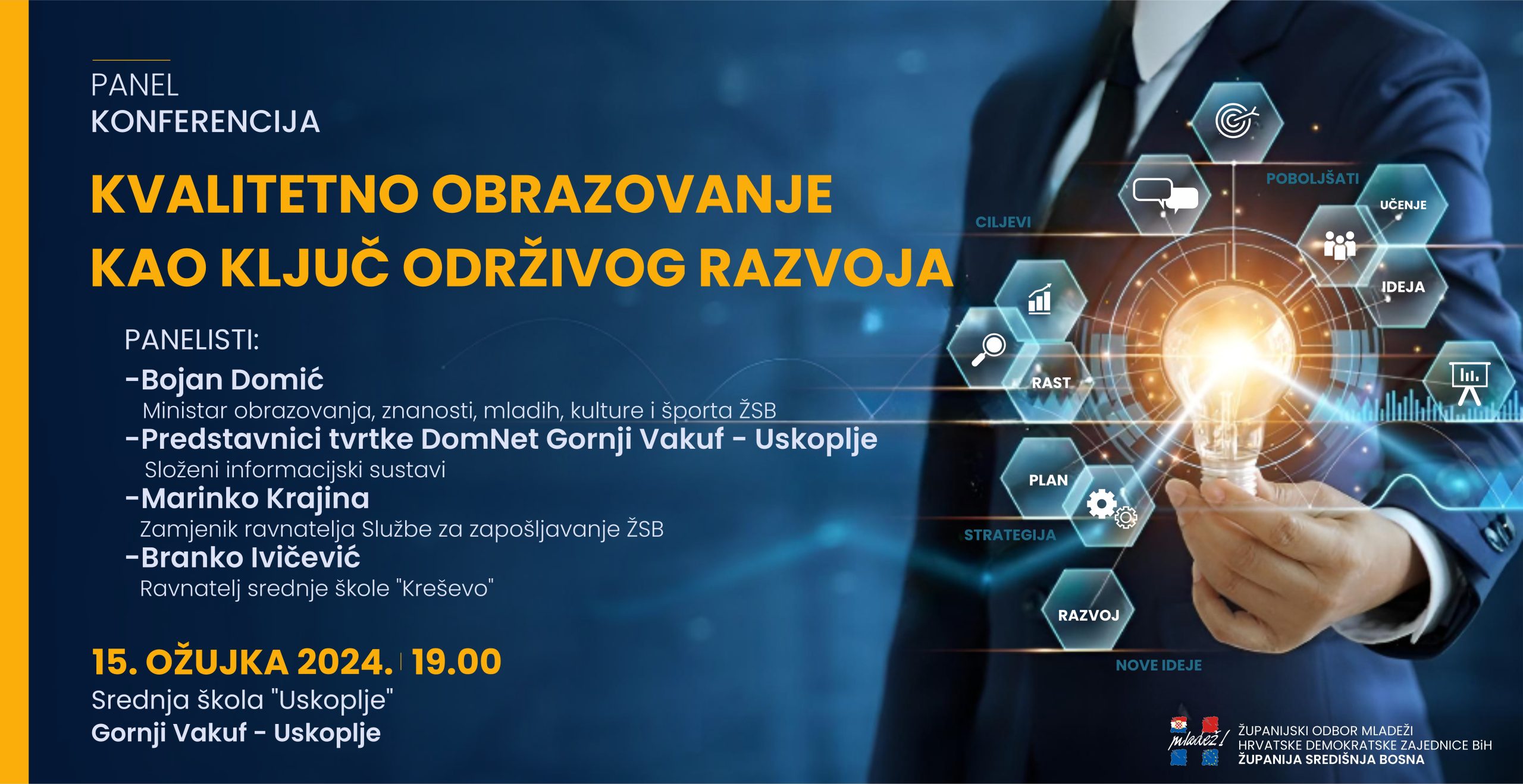 15.ožujka.2024.godine Srednja škola Uskoplje biti će domaćin panel konferencije “Kvalitetno obrazovanje kao ključ održivog razvoja”. Na konferenciji sudjeluju ministar Bojan Domić, predstavnici firme DomNet Uskoplje, Marinko Krajina i Branko Ivičević.