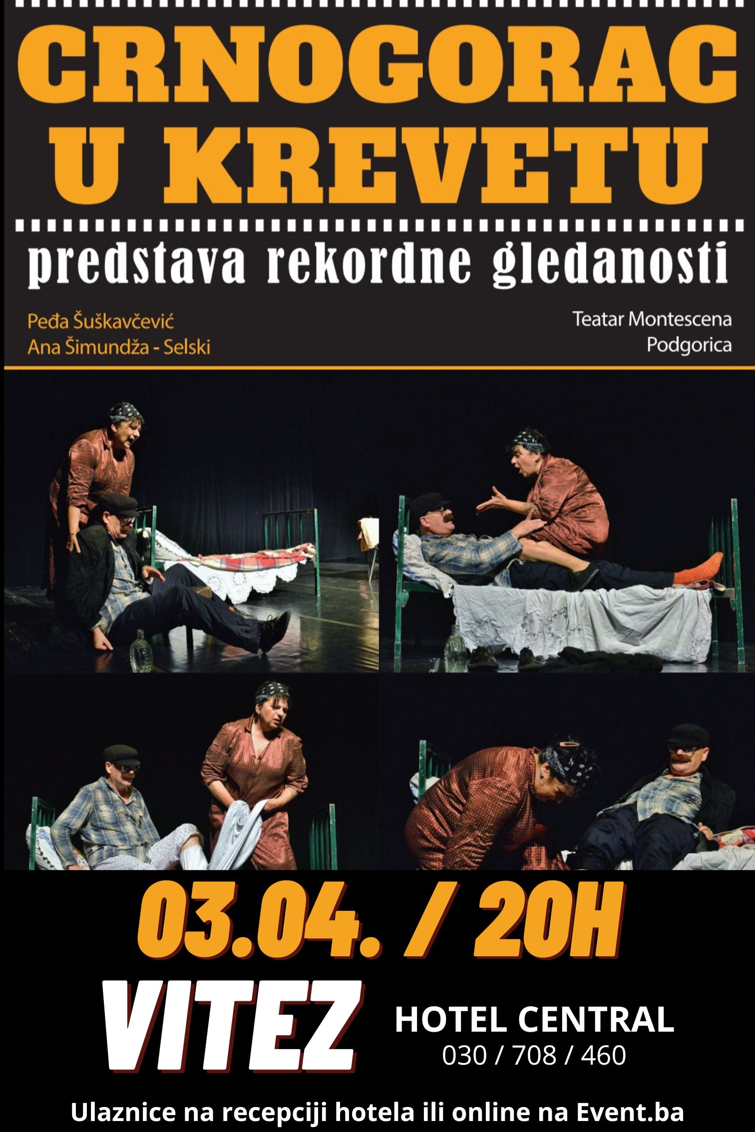 Jedna od najgledanijih predstava u regionu “Crnogorac u krevetu” stiže u Vitez. Predstava će se odigrati u srijedu 03.04.2024. godine s početkom u 20 sati u Franšiznom centru hotela Central