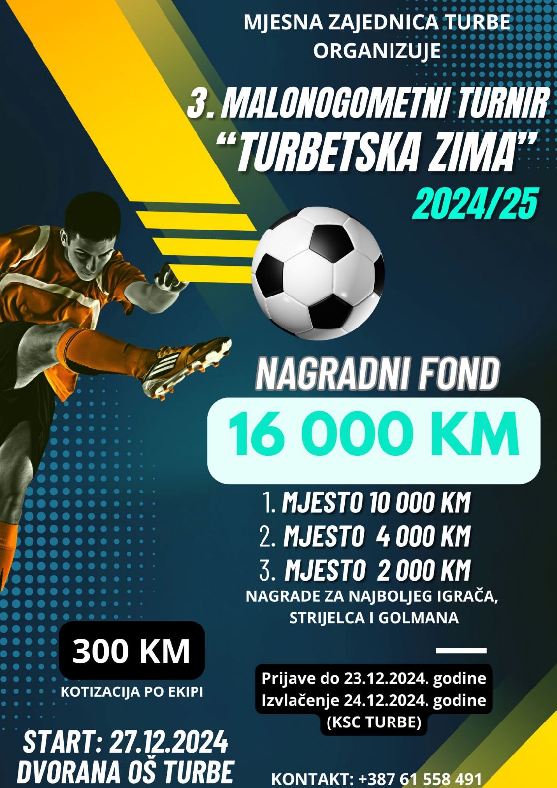 3. MALONOGOMETNI TURNIR “TURBETSKA ZIMA 2024/25” Otvorene prijave za jedan od najjačih i najprestižnijih turnira u Bosni i Hercegovini. – NAGRADNI FOND 16 000 KM 1.mjesto 10 000 KM