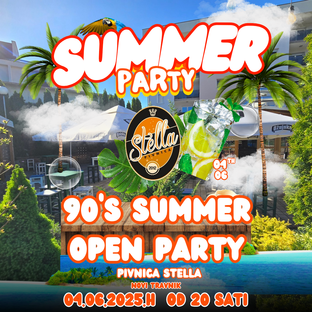 🌴 Večeras u Pivnici Stella 🌴 🎉 90’s Summer Open Party! 🎶 Pripremite se za povratak u zlatne ’90-e! 💿 Večeras vas čeka nezaboravna ljetna žurka uz najveće hitove desetljeća,