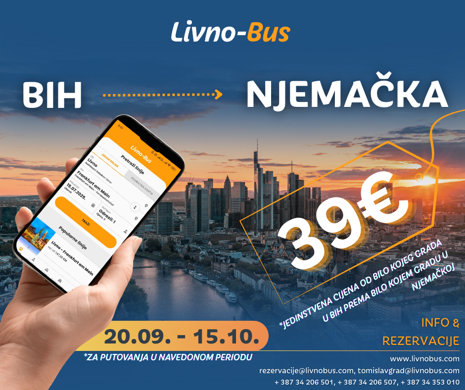 Na liniji od Mostara do Frankfurta, putujte iz bilo kojeg grada u BiH do Njemačke po super cijeni. Jedan od vodećih prijevoznika u regiji, Livno Bus, pripremio je posebnu ponudu