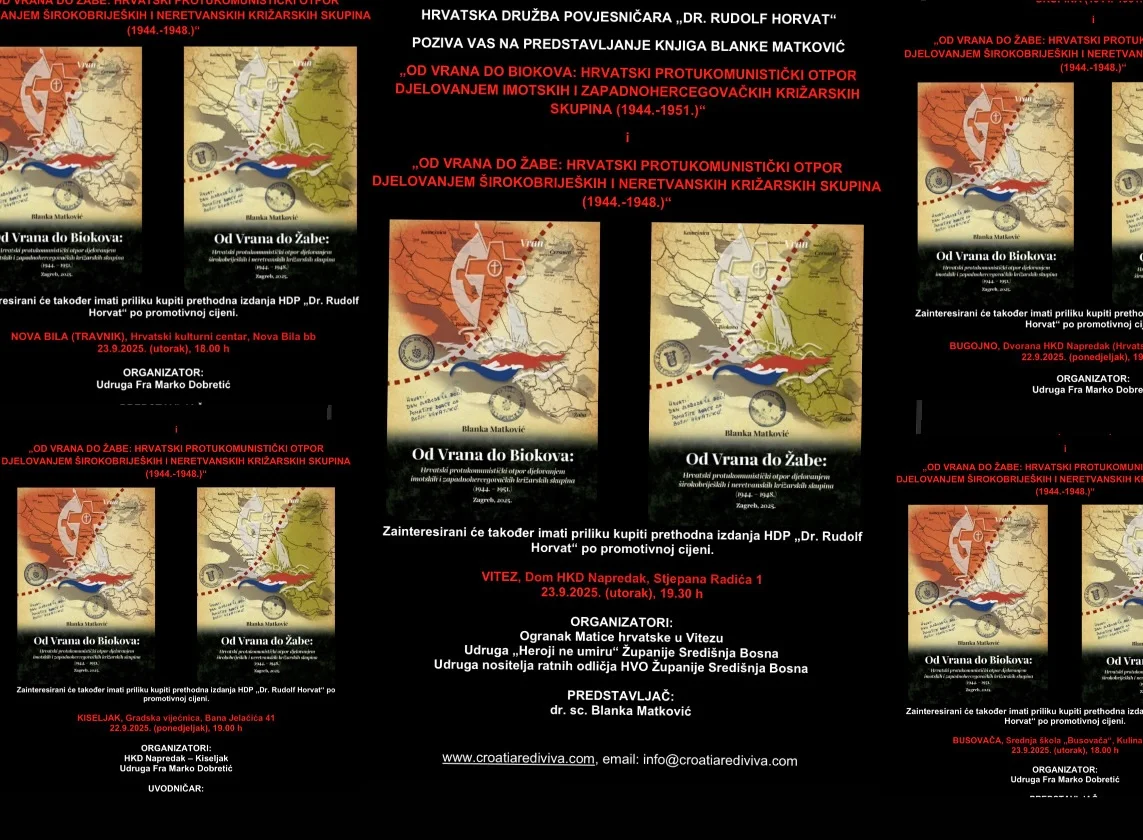 Hrvatska družba povjesničara „Dr. Rudolf Horvat“ u suradnji s lokalnim udrugama i ustanovama organizira predstavljanje dviju knjiga dr. sc. Blanke Matković u više gradova Središnje Bosne. Predstavljaju se znanstvene monografije: