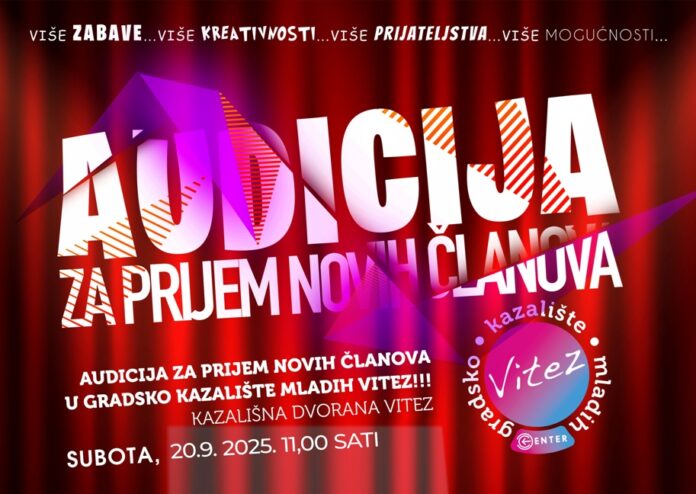 Gradsko kazalište mladih Vitez organizira audiciju za prijem novih članova i otvara svoja vrata svima koji žele zakoračiti u svijet glume, plesa, pjesme i nezaboravnih kazališnih trenutaka. Audicija će biti