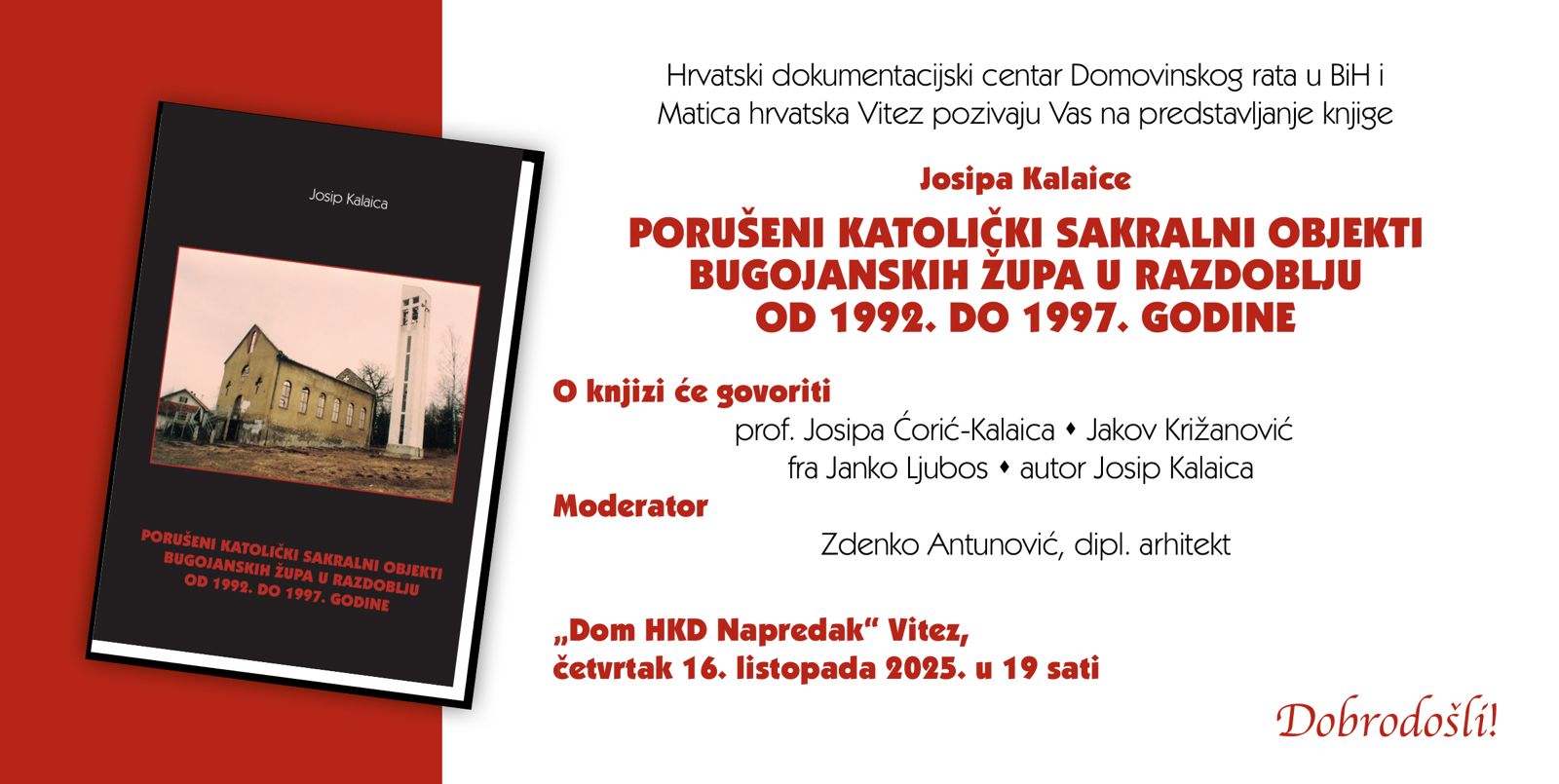 Predstavljanje knjige Josipa Kalaice u Vitezu: svjedočanstvo o porušenim katoličkim sakralnim objektima Bugojanskog kraja Hrvatski dokumentacijski centar Domovinskog rata u BiH i Matica hrvatska Vitez organiziraju predstavljanje knjige „Porušeni katolički