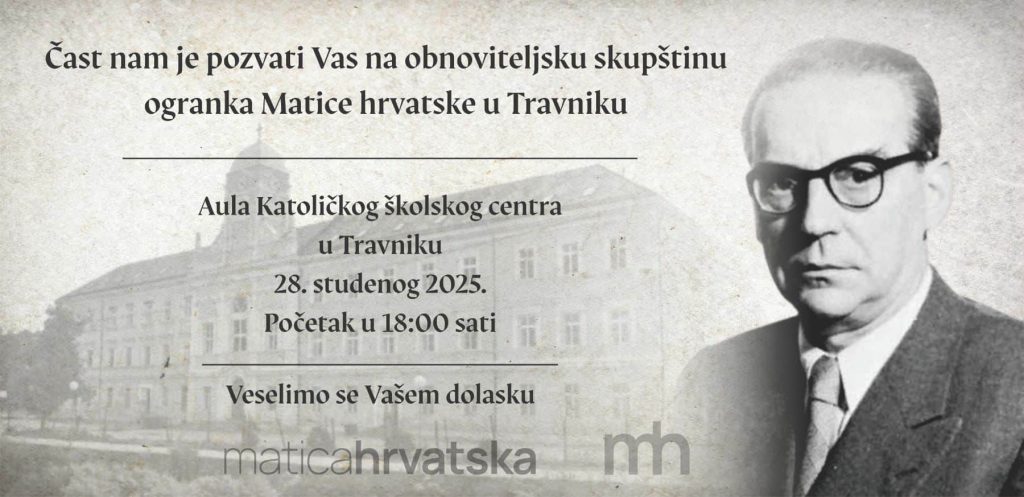 U Travniku će se 28. studenog 2025. ( petak) s početkom od 18:00 sati u Auli Katoličkog školskog centra “Petar Barbarić” održati obnoviteljska skupština ogranka Matice hrvatske Travnik, jednog od