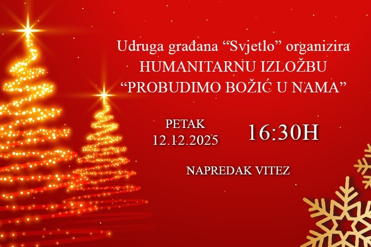 Udruga građana ”Svjetlo” organizira humanitarnu izložbu ”Probudimo Božić u nama”. Izložba će se održati u petak, 12. prosinca 2025. godine s početkom u 16:30 sati u dvorani HKD Napredak Vitez.