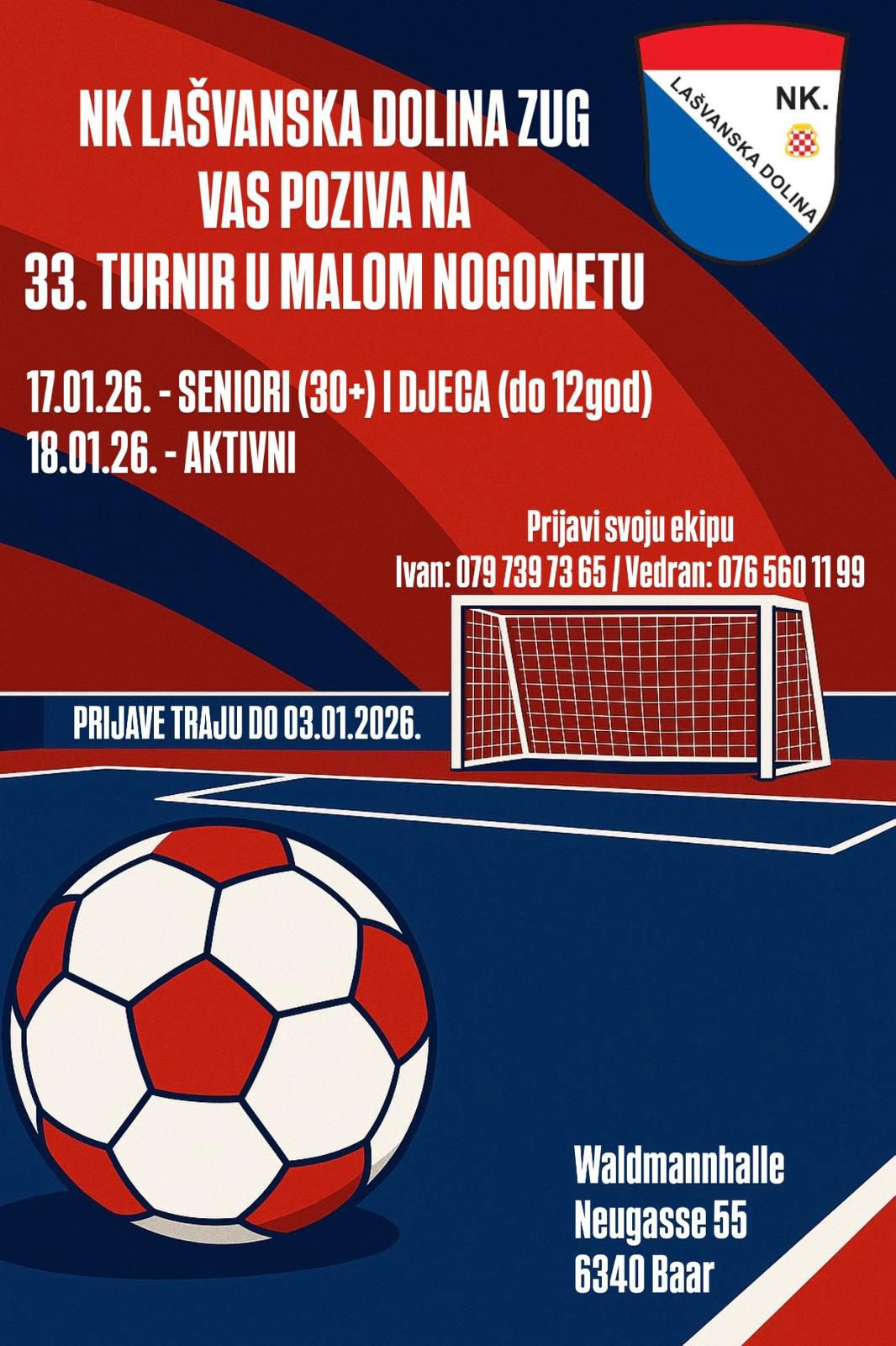 NK Lašvanska dolina Zug organizira 33. turnir u malom nogometu, koji će se održati 17. i 18. siječnja 2026. godine u sportskoj dvorani Waldmannhalle u Baaru (Neugasse 55). Prvog dana