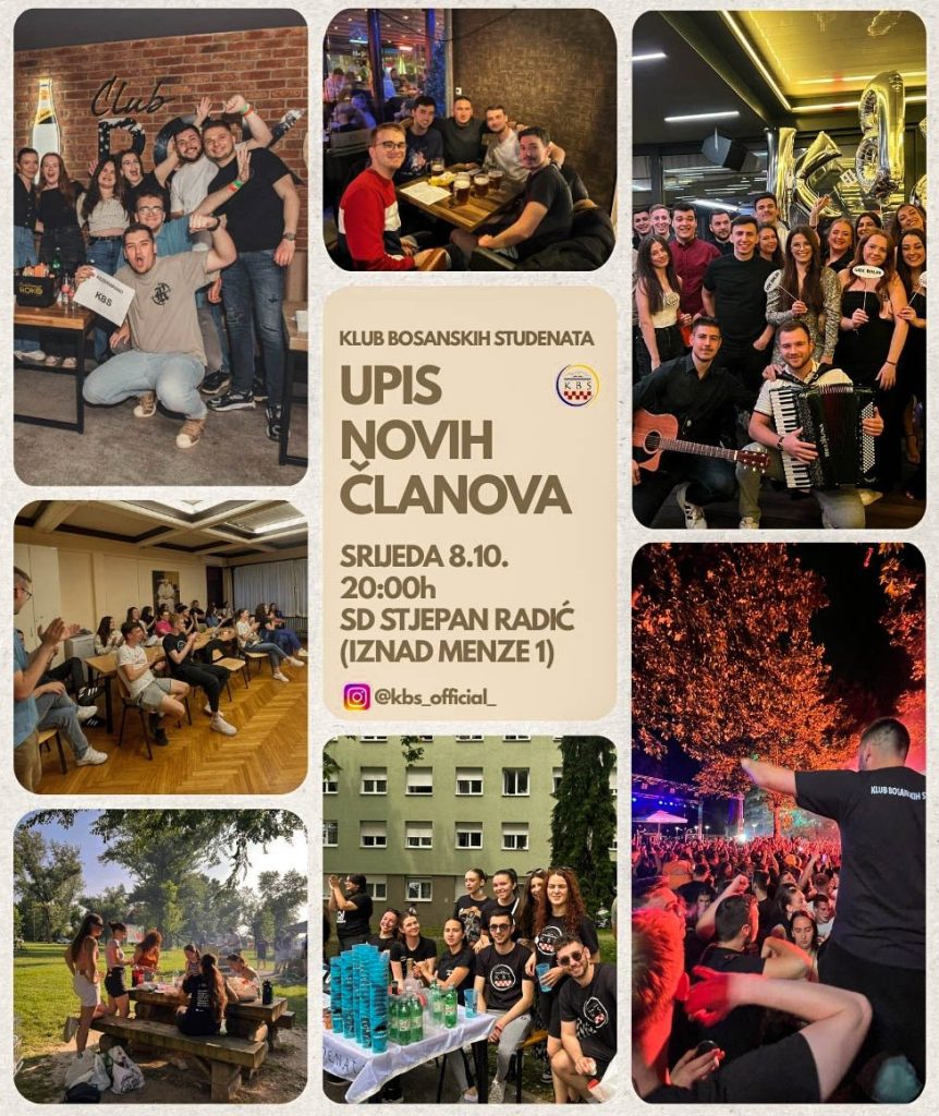 “Klub bosanskih studenata (KBS) poziva sve studentice i studente koji dolaze iz Bosne, a studiraju u Zagrebu da nam se pridruže u novoj akademskoj 2025./2026. godini. KBS kao studentska udruga okuplja mnoštvo mladih ljudi kojima je cilj bolje upoznavanje svojih zemljaka. Pridružite nam se na našem prvom sastanku u srijedu 8. listopada 2025. u studentskom domu Stjepan Radić i budite dio veselog društva koje već godinama okuplja mlade ljude i stvara brojna prijateljstva!
