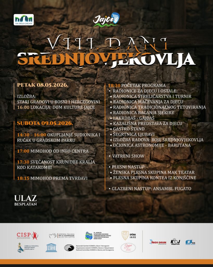 U kraljevskom gradu Jajcu, 8. i 9. svibnja 2026. godine, održat će se festival „VIII. Dani srednjovjekovlja“. Ove godine će program biti obogaćen raznim aktivnostima koje pružaju jedinstven uvid u život srednjeg vijeka te povezuju zaštitu naslijeđa s posjetiteljima i lokalnim stanovništvom.
