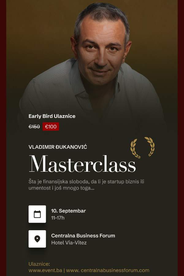 Pridružite nam se na ekskluzivnom masterclass-u sa jednim od najcjenjenijih stručnjaka u oblasti investicija, finansija i biznisa, Vladimirom Đukanovićem, koji će se održati 10. Septembra 2025. godine u prestižnom hotelu Via, u Vitezu.
