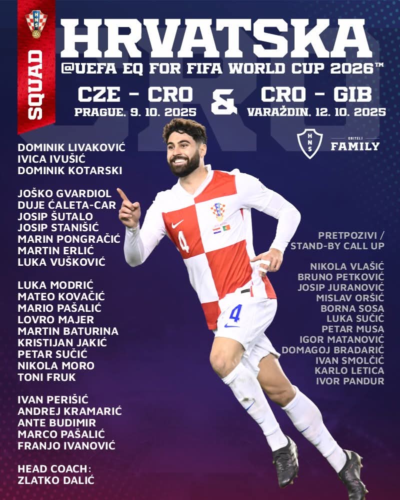 ZLATKO DALIĆ objavio je popis za listopadski ciklus kvalifikacija za Svjetsko prvenstvo. Hrvatska 9. listopada u Pragu igra protiv Češke, a 12. listopada u Varaždinu dočekuje Gibraltar. Pobjeda nad Češkom praktično bi osigurala prvo mjesto u skupini i plasman na Svjetsko prvenstvo u Sjedinjenim Američkim Državama, Meksiku i Kanadi.