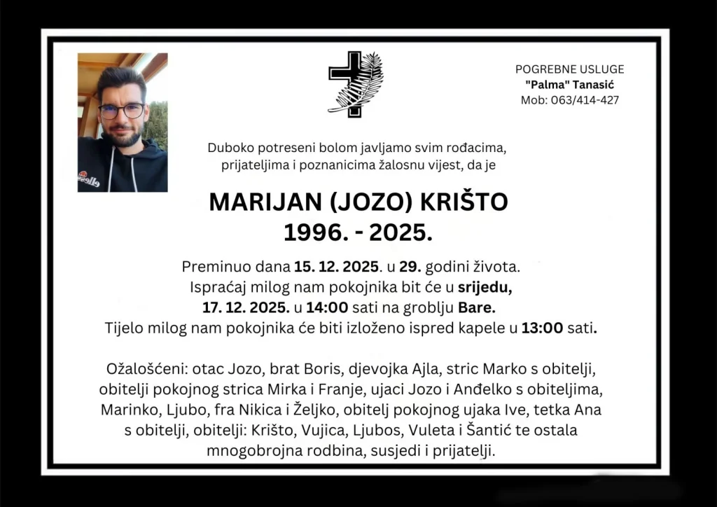 Duboko potreseni bolom, obitelj i rodbina obavještavaju javnost da je preminuo Marijan (Jozo) Krišto, rođen 1996. godine.