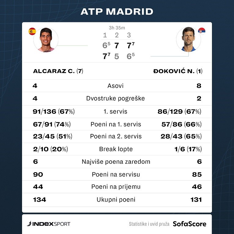 Alcaraz pri vodstvu 2:1 imao tri brejk lopte, u sljedećem servis gemu Đokovića još dvije, a jedinu u trećem setu Novak je imao kod rezultata 3:3. Morao je Đoković spasiti i brejk loptu pri 4:5, a u tie-breaku je Alcaraz 51. winnerom na meč loptu došao do velike pobjede.