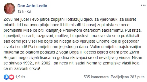 “Zovu me jučer i evo jutros župljani i otkazuju djecu za vjeronauk, za susret mladih itd i naravno pitaju hoće li biti misa!!! U našoj župi ništa se neće promijeniti! Mise će biti, klanjanje Presvetom oltarskom sakramentu, Put križa, ispovijedi, susreti, razgovori, molitve, blagoslovi…ma sve što smo prakticirali sad ćemo još više! Ne bojte se ničega ako vjerujete Onome koji je gospodar života i smrti! Pa i umrijeti nam je jednoga dana. Volim umrijeti u najstrašnijim mukama za oltarom podižući Živoga Boga ili klečeći ispred oltara pred Živim Bogom, nego živjeti tisućama godina skrivajući se od nevidljivog virusa. Nisam se skrivao 1992., niti 2002., pa neću niti sada! Nema te zemaljske vlasti koja će mi zatvoriti crkvu”, napisao je don Ante Ledić.