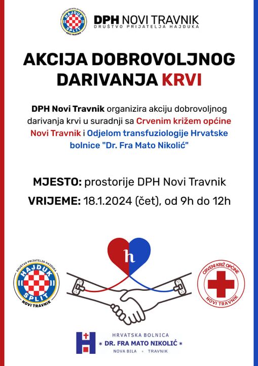 DPH Novi Travnik u suradnji s Crvenim križem općine Novi Travnik i Odjelom transfuziologije Hrvatske bolnice “Dr. Fra. Mato Nikolić” organizira akciju dobrovoljnog darivanja krvi.