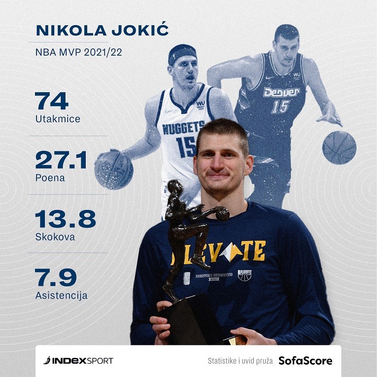 KOŠARKAŠ Denver Nuggetsa Nikola Jokić bit će proglašen MVP-jem u NBA ligi drugu godinu zaredom, tvrdi pouzdani ESPN-ov novinar Adrian Wojnarowski. Prema njegovim navodima, Jokić je pobijedio na glasanju, a službena objava izaći će ovaj tjedan. Jokićeva statistika ove je sezone još bolja nego prethodne. U prosjeku je u regularnoj sezoni zabijao 27.1 poen, hvatao 13.8 skokova i dijelio 7.9 asistencija.