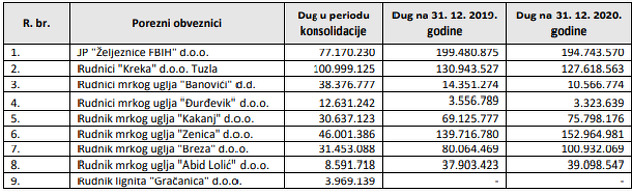 “Zbog nastanka novog duga u 2020. godini kod pojedinih poreznih obveznika, Porezna uprava FBiH pokrenula je aktivnosti blokade transakcijskih računa. Međutim, Vlada FBiH donijela je zaključke kojima je zadužila Poreznu upravu da odgodi sve aktivnosti prinudne naplate, zbog čega je naplata duga kod rudnika kod kojih je utvrđen rast duga u 2020. godini prolongirana do 31. 1. 2022. godine. Pored toga, Zakonom o financijskoj konsolidaciji privrednih društava u FBiH, koji je donesen 2014. godine, definirano je da se u toku postupka konsolidacije ne mogu pokrenuti postupci prinudne naplate nad imovinom društava s većinskim učešćem državnog kapitala koje se konsolidira”, podaci su iz izvještaja.