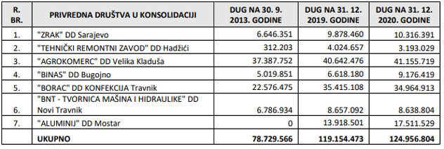 “Ukupna dugovanja sedam poreznih obveznika na dan 31. 12. 2019. godine iznosila su 119.154.473 KM, što znači da su u 2020. godini ona porasla za oko 5,8 milijuna KM. Iako je dug ovih poreznih obveznika u 2020. godini znatno porastao, Porezna uprava FBiH od stupanja na snagu Zakona o financijskoj konsolidaciji privrednih društava u FBiH ne može provoditi postupke prinudne naplate nad društvima koja su u postupku konsolidacije. Također, ističemo da je odredbama ovog zakona definirano da, ako društvo s većinskim učešćem državnog kapitala koje se konsolidira ne počne izmirivati svoje tekuće financijske obaveze u roku od 60 dana od dana donošenja odluke, nadležni organ donijet će odluku kojom stavlja van snage svoju odluku o financijskoj konsolidaciji tog društva, što kod ovih privrednih društava nije učinjeno”, stoji u izvještaju.