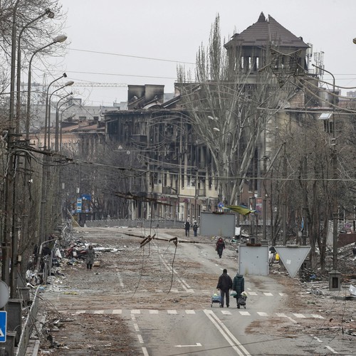 MARIUPOLJ, nekad prosperitetan lučki grad s oko 440.000 stanovnika, nakon razornih napada koji traju već sedam tjedana pretvoren je u ruševine. Tisuće ljudi su ubijene u opsadi, koja je započela kada su ruske snage počele okruživati grad početkom ožujka. Fotografije svjedoče o uništenju grada.