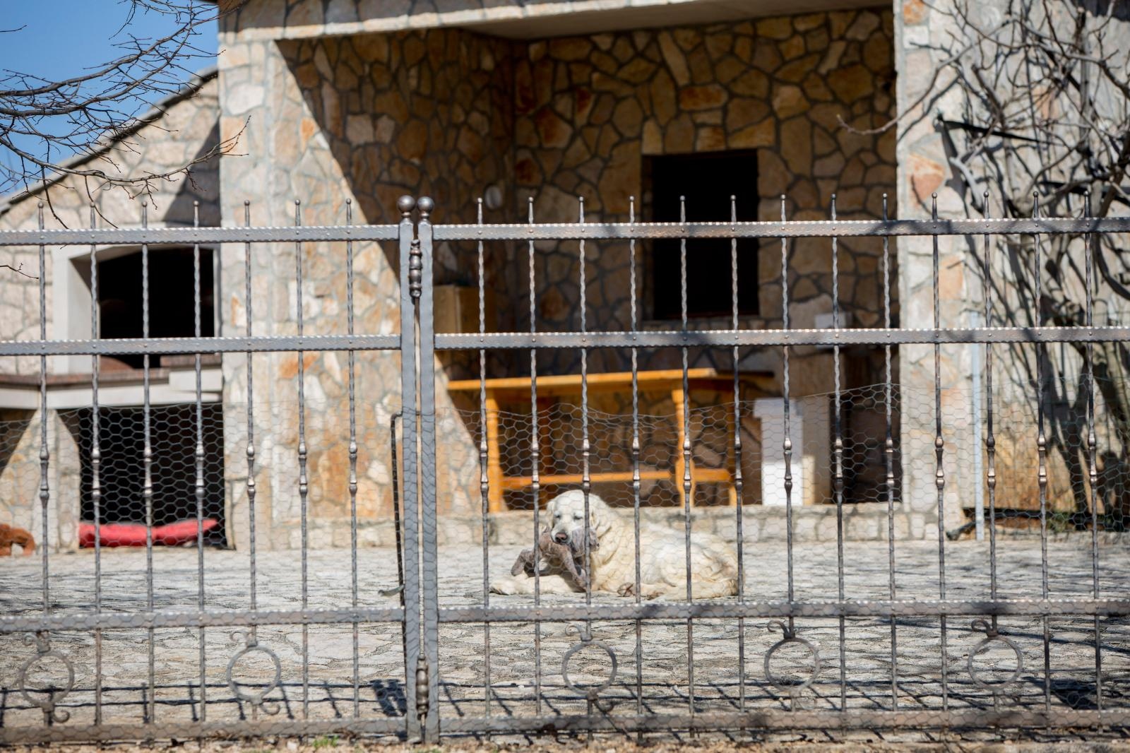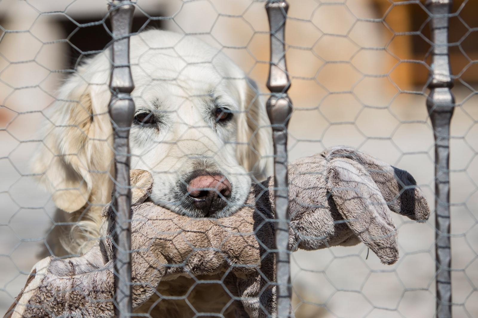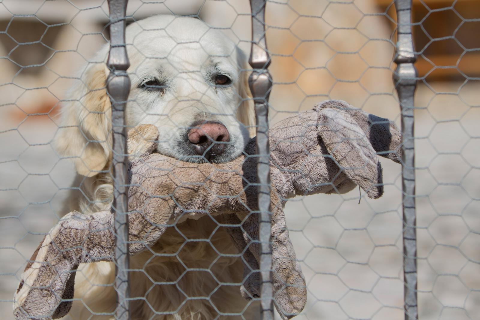 Samo u zubima drži svoju omiljenu plišanu igračku i pogledava u daljinu, kao da se nada da će gazda doći.