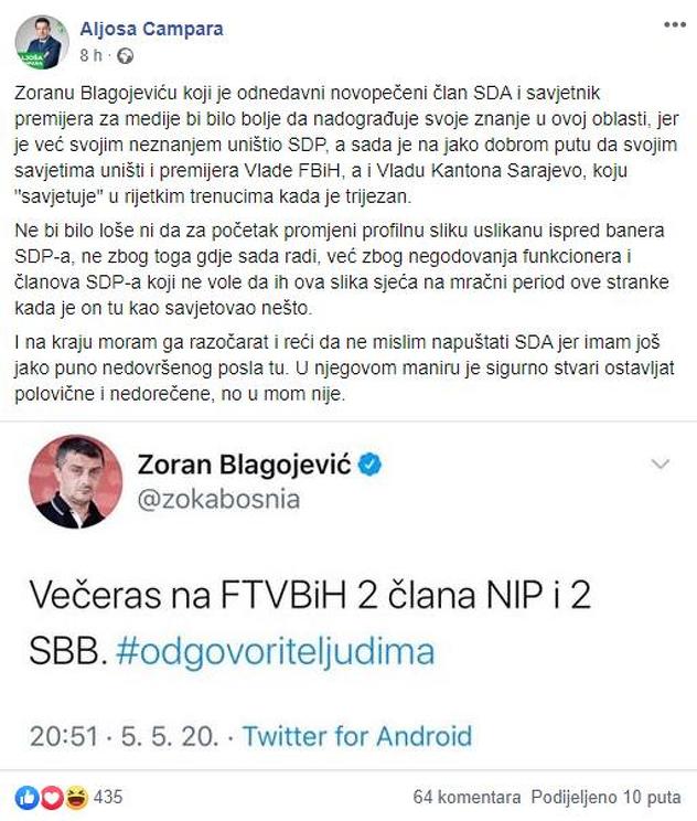 “Zoranu Blagojeviću, koji je odnedavno član SDA i premijerov savjetnik za medije, bi bilo bolje da nadograđuje svoje znanje u ovoj oblasti, jer je svojim neznanjem već uništio SDP, a sada je na dobrom putu da svojim savjetima uništi i premijera Vlade FBiH, a i Vladu Kantona Sarajevo koju ‘savjetuje’ u rijetkim trenucima kada je trijezan”, naveo je Čampara.
