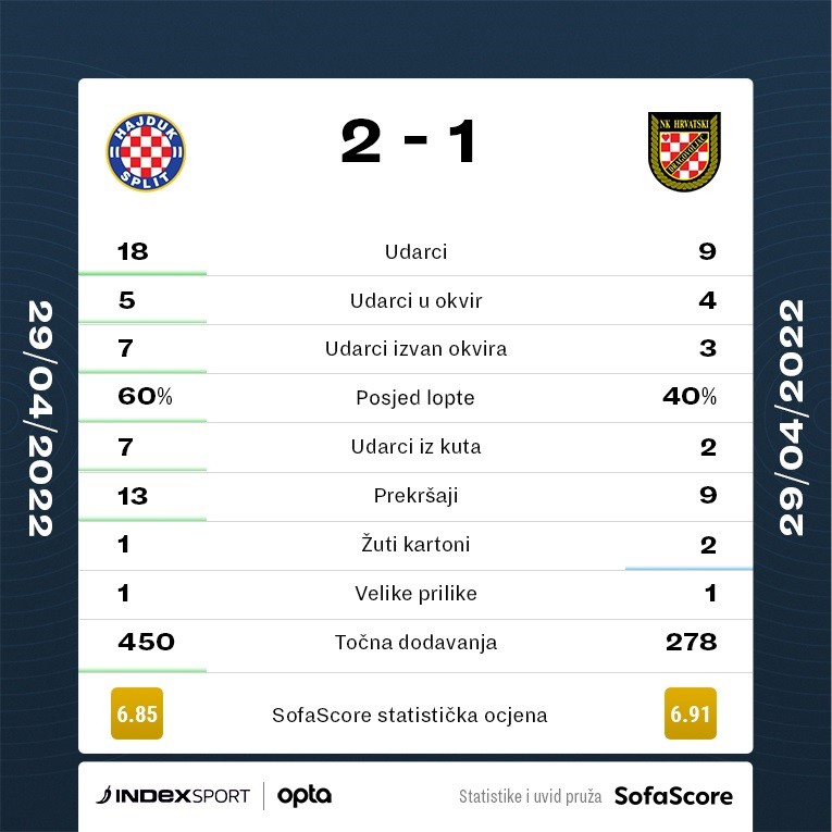 Šansi je bilo na obje strane terena, nešto više onih koje su dolazile iz akcija domaće momčadi. VAR je u nekoliko navrata provjeravao sporne situacije kod padova hajdukovaca u kaznenom prostoru suparnika, no ostajao je nijem u tim situacijama.