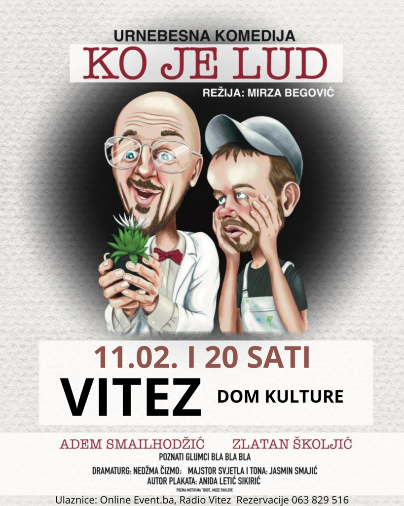 Komedija “Ko je lud?” u izvedbi dvojice glumaca, Adema Smailhodžića i Zlatana Školjića, poznatih po filmu “Amanet” ovoga će vikenda biti odigrana u Kazališnoj dvorani Vitez. Predstava je na rasporedu u nedjelju, 11.2. 2024. godine, s početkom u 20,00 sati, a cijena ulaznice je 10 KM.