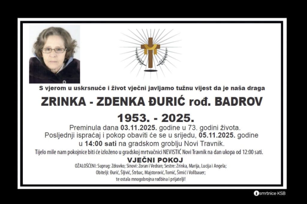 - Sahrana će se obaviti: Srijeda, 5. studenog 2025. godine