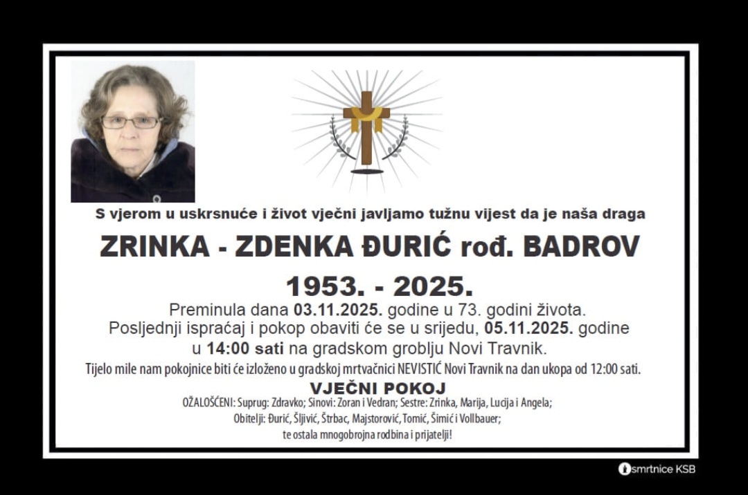 S tugom javljamo da je preminula Zrinka-Zdenka Đurić, dugogodišnja i cijenjena zaposlenica Hrvatske bolnice “Dr. fra Mato Nikolić” Nova Bila.