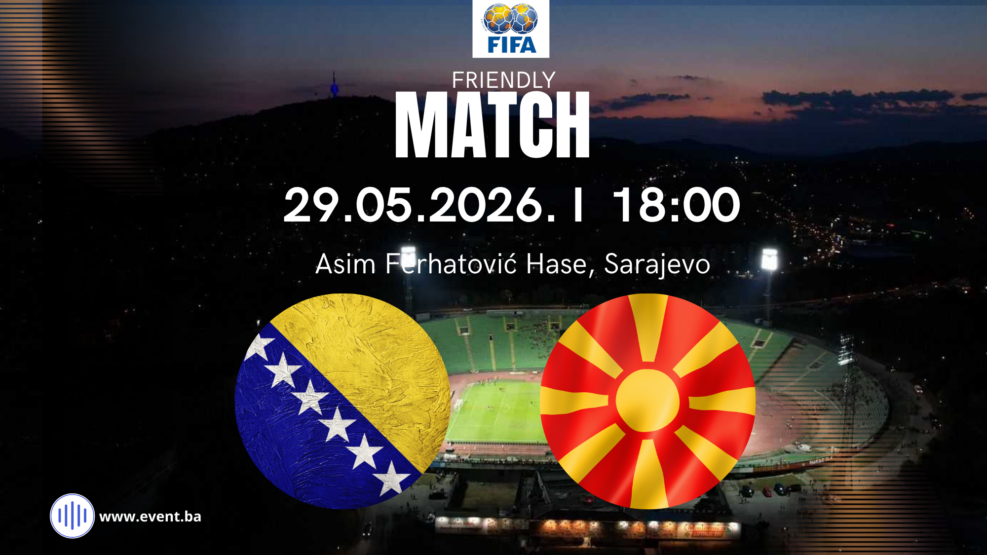 Prijateljska utakmica između reprezentacija Bosne i Hercegovine i Sjeverne Makedonije biti odigrana 29. maja 2026. godine na stadionu „Asim Ferhatović-Hase“ u Sarajevu, sa početkom u 18:00 sati.