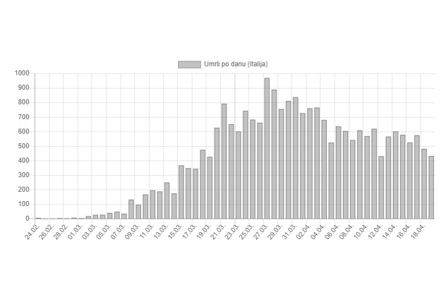 Prema podacima Civilne zaštite Italije, u posljednja 24 sata preminulo je 433 osobe. Italija je ukupno do sada registrirla 178.972 osoba zaraženih koronavirusom.