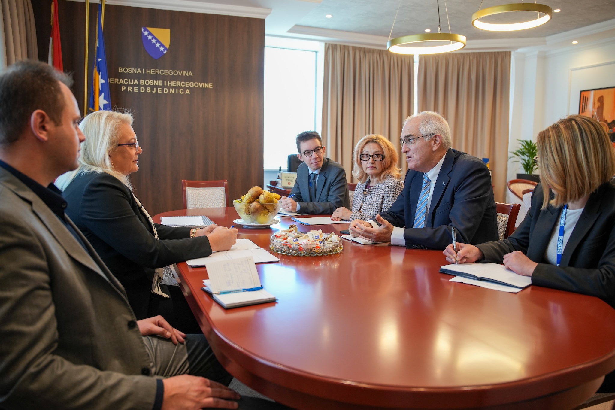 Šef Misije OESS-a Rick Holtzapple zahvalio je predsjednici Bradari na srdačnom prijemu i konstruktivnoj razmjeni mišljenja, istaknuvši spremnost OESS-a da nastavi podupirati reforme, jačanje povjerenja te vladavinu prava i borbu protiv korupcije.