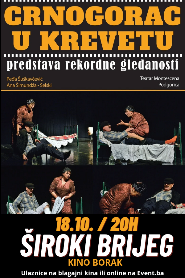 U kinu Borak (Hrvatski kulturni dom), s početkom u 20 sati, publika će moći uživati u komediji rekordne gledanosti “Crnogorac u krevetu” — predstavi koja već više od deset godina puni dvorane diljem regije.
