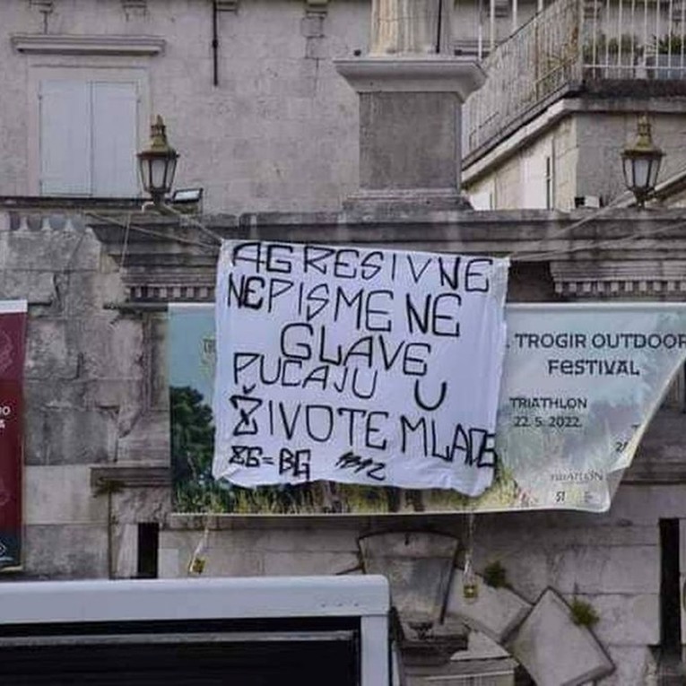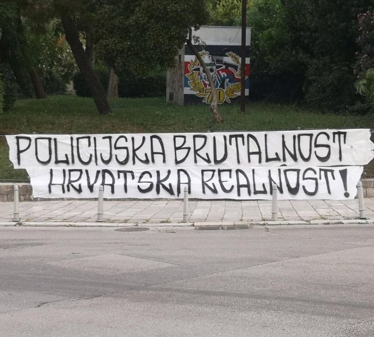 “Agresivne, nepismene glave, pucaju u živote mlade”, stoji na transparentu obješenom na jednom nadvožnjaku, a u samom gradu na drugom transparentu piše: “Policijska brutalnost, hrvatska realnost.”