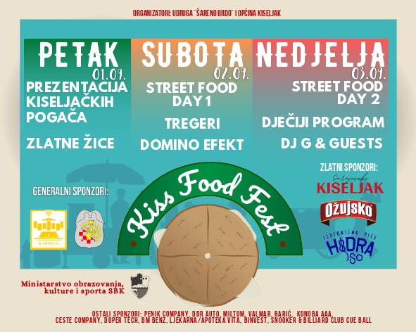 S drugim danom festivala započinje i Street Food program, gdje će brojni izlagači imati priliku predstaviti svoje gastronomske vještine, ali i male i srednje biznise koje su pokrenuli. Sva zainteresirana fizička i/ili pravna lica koja žele prezentirati svoje male i srednje biznise ili pak svoje gastronomske vještine svoje učešće mogu prijaviti putem Javnog poziva najkasnije do 15. kolovoza 2023. godine, koji možete pronaći ovdje. Wiener Street Food, Vinarija Pejčinović, Pizzeria Casablanca te Slatki kutak Sandre i Mie neki su od već poznatih izlagača na ovogodišnjem festivalu. Bendovi Domino Efekt i Tregeri zabavljat će posjetitelje tokom drugog dana programa. Zadnji dan festivala – Dječiji dan, posvećen je najmlađim posjetiteljima, koji će imati priliku uživati i zabavljati se uz raznovrsan program. Treći dan je također i Street Food Day 2, tijekom kojeg će biti organizirano glasanje i izbor najboljih izlagača festivala. Pobjednike očekuju vrijedne nagrade, pri čemu će neke od njih obezbijediti Molson Coors BH d.o.o. i brend Ožujsko pivo. Glazbene izvedbe trećeg dana festivala rezervirane su za Dj G i Dj Soul.Udruga “Šareno brdo” s veseljem očekuje sve zainteresirane posjetitelje, a isti više informacija o Kiss Food Festu mogu pronaći na njihovim društvenim mrežama – Udruga “Šareno brdo” na mreži Facebook te @kissfoodfest na mreži Instagram!
