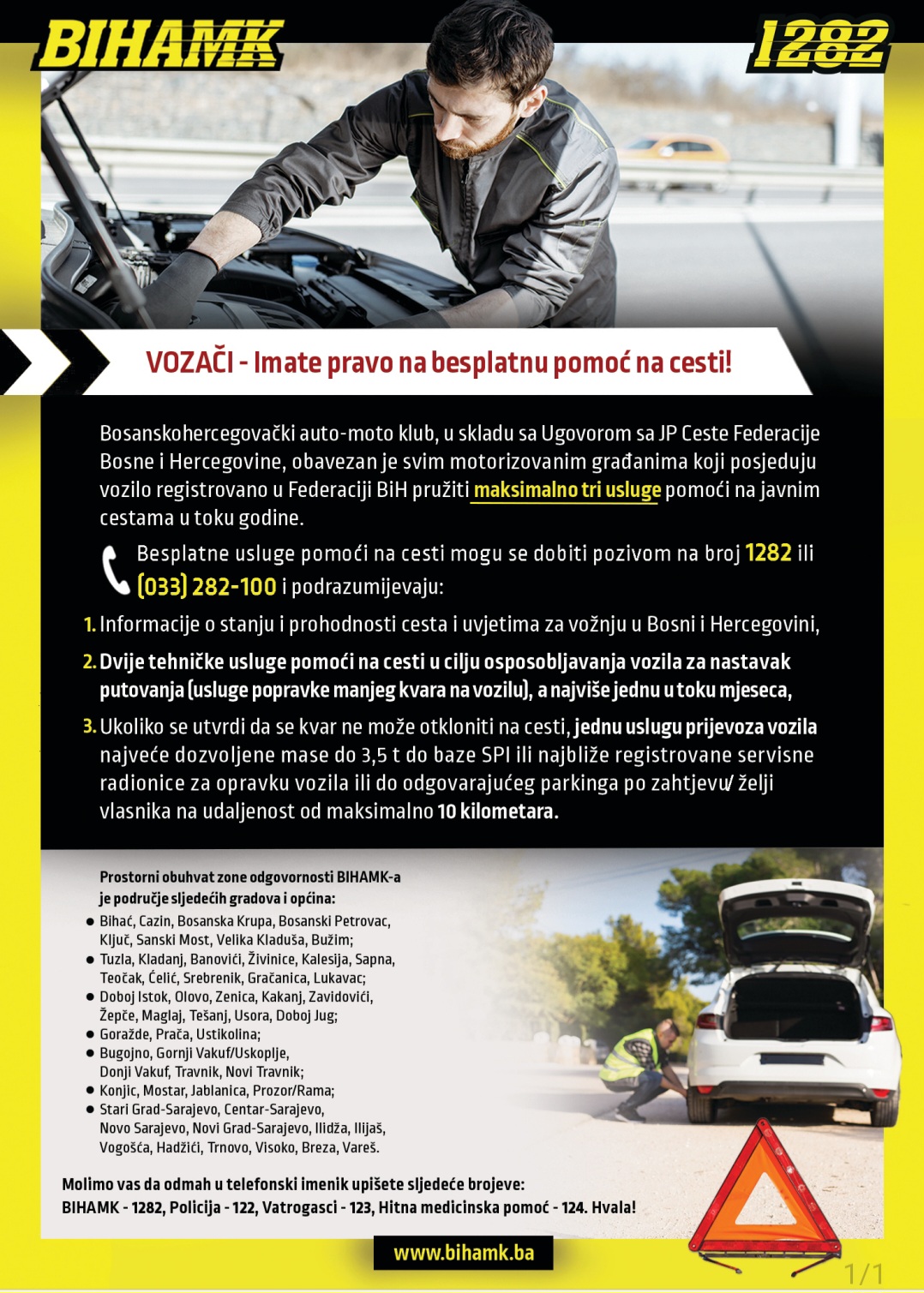 Bosanskohercegovački auto-moto klub, u skladu sa Ugovorom sa JP Ceste Federacije Bosne i Hercegovine, obavezan je svim motorizovanim građanima koji posjeduju vozilo registrovano u Federaciji BiH pružiti maksimalno tri usluge
