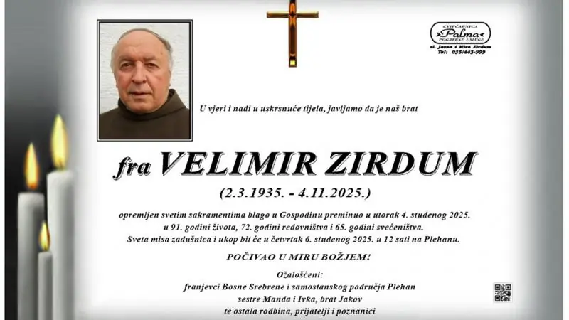 U 91. godini života, 72. godini redovništa i 65. godini svećeništva u Domu za starije i nemoćne osobe u Slavonskom Brodu preminuo je fra Velimir Zirdum, svećenik franjevac Bosne Srebrene..
