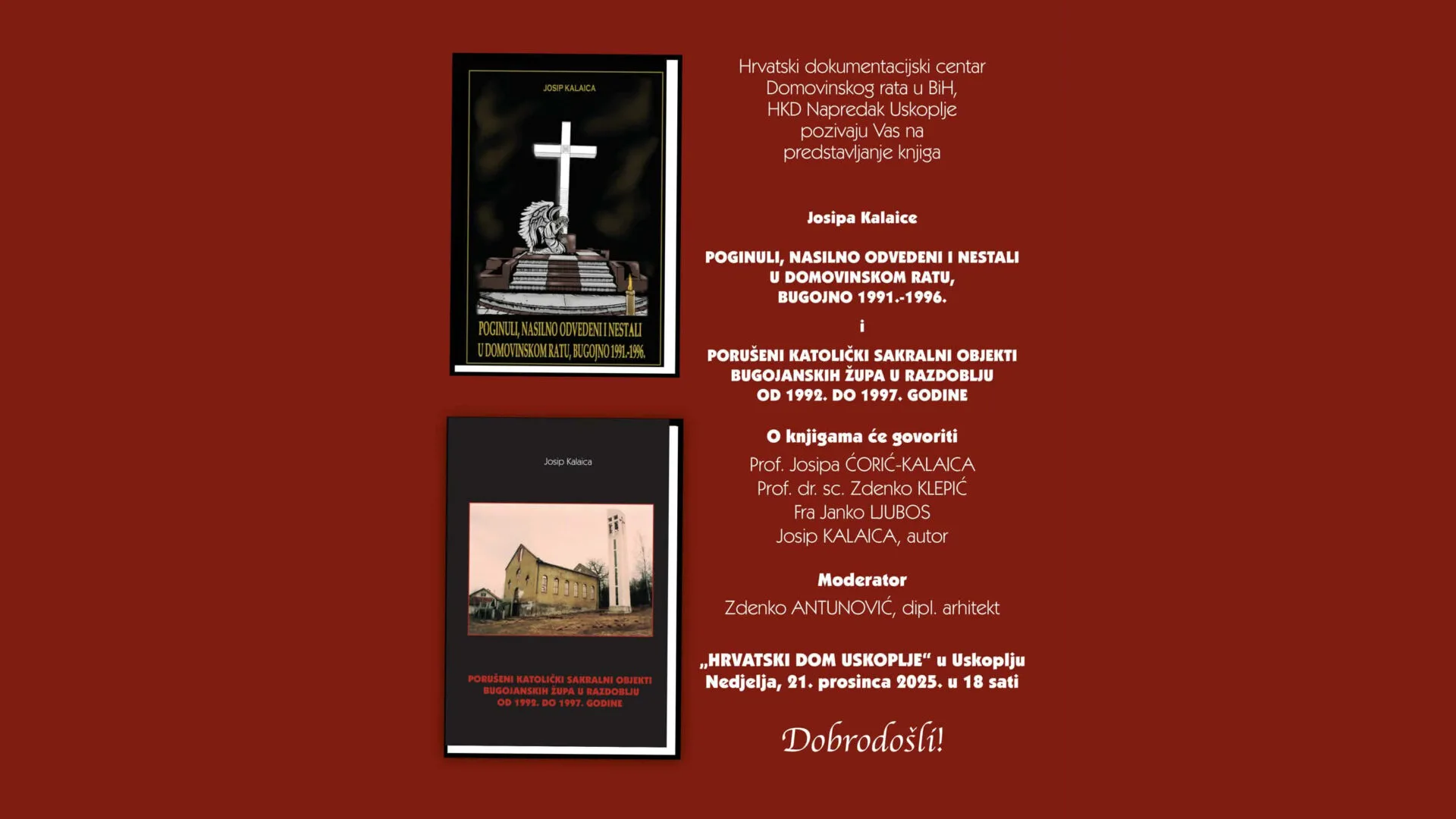 U nedjelju, 21. prosinca 2025. u 18 sati, u Hrvatskom domu u Uskoplju bit će predstavljene dvije knjige autora Josipa Kalaice, posvećene stradalima, nestalima te porušenim katoličkim sakralnim objektima na