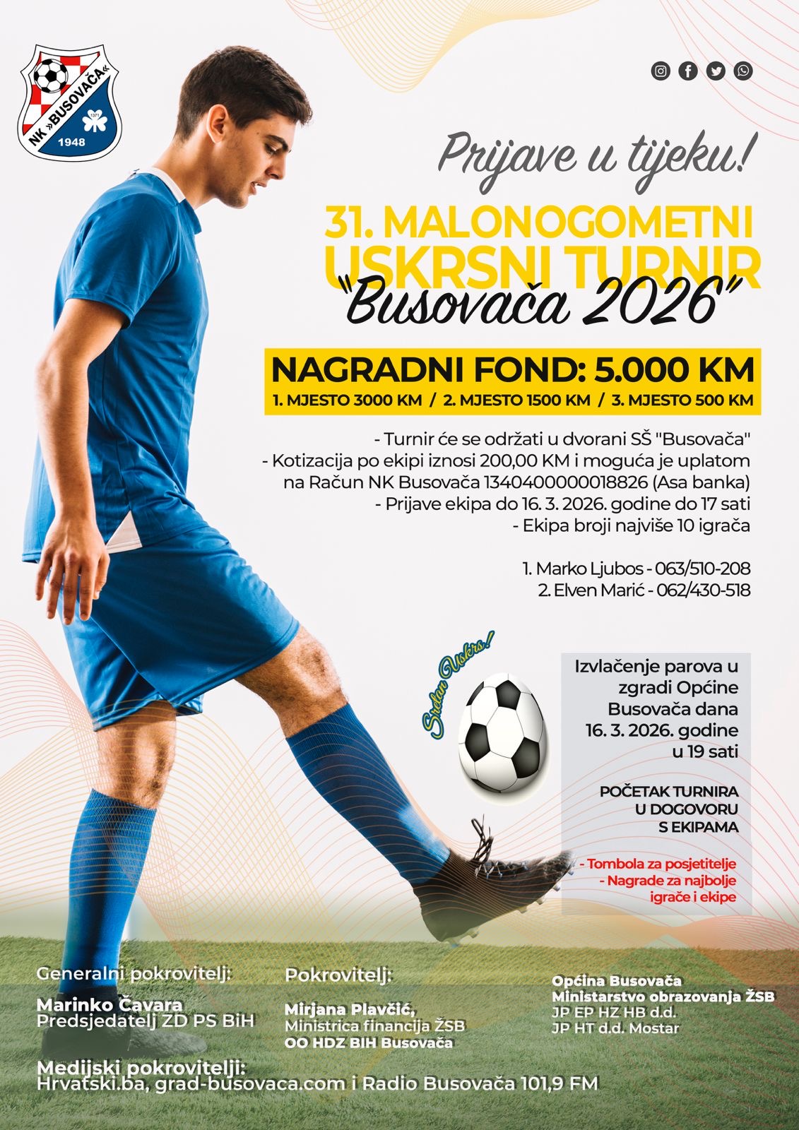 Nogometni klub NK Busovača otvorio je prijave za 31. malonogometni Uskrsni turnir „Busovača 2026“, koji će se održati u dvorani Srednje škole “Busovača”. Turnir i ove godine okuplja brojne ekipe