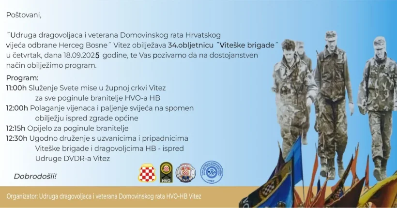 Udruga dragovoljaca i veterana Domovinskog rata HVO HB Vitez u četvrtak, 18. rujna 2025. godine, organizira obilježavanje 34. obljetnice Viteške brigade HVO-a. Program obilježavanja započinje u 11:00 sati svetom misom