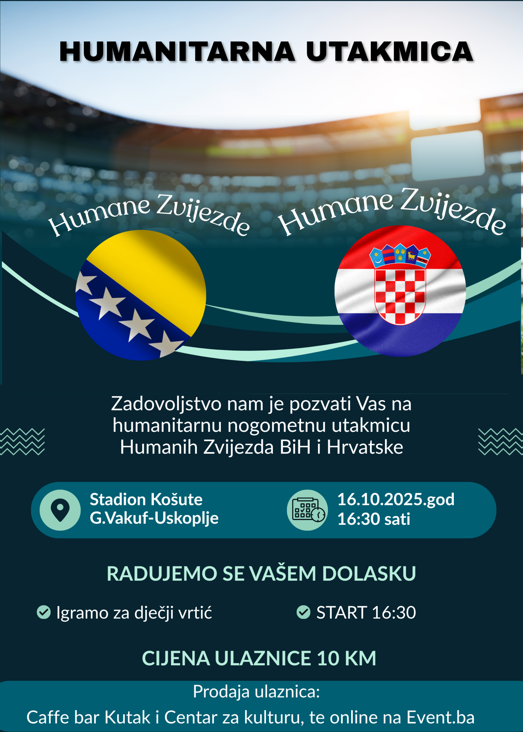 Gornji Vakuf-Uskoplje uskoro će biti domaćin sportskog događaja koji se s nestrpljenjem iščekuje širom regije! Na stadionu Košute će se 16.10. 2025. godine odigrati humanitarna utakmica između Humanih zvijezda Bosne