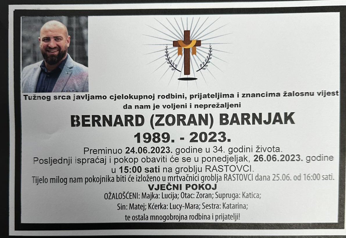 Tužna srca javljamo da nas je dana 24.06.2023.godine u 34.godini iznenada napustio novotravničanin Bernard Barnjak.