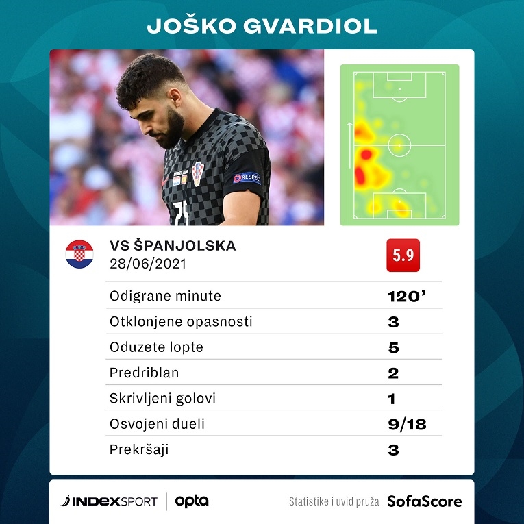 Izbornik Dalić je ostao bez do tada glavnog lijevog bočnog Borne Barišića, nakon čije ozljede nije na tu stranu postavio očekivanog Domagoja Bradarića, nego Gvardiola. On igra i kao stoper i lijevi bočni, a Daliću je bio bek. Gvardiol u četiri utakmice Eura nije igrao samo zadnjih 20 minuta protiv Škotske.