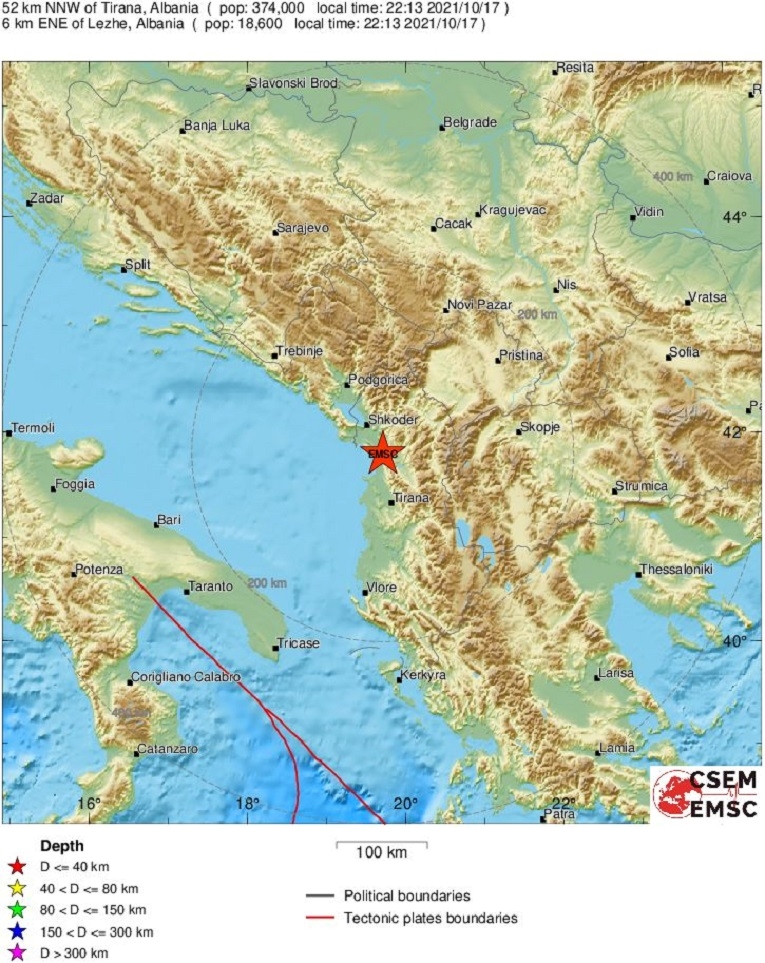 Do potresa je došlo u 22:13 sati. Epicentar je 52 kilometra sjeverozapadno od Tirane.