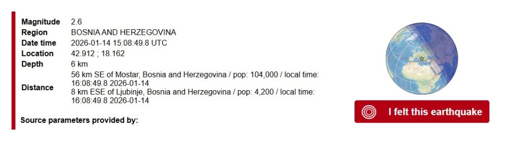 Potres magnitude 2,6 po Richterovoj ljestvici pogodio je područje istočne Hercegovine, izvještava EMSC.