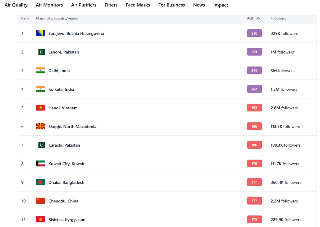 Portal IQAir, koji prati indeks zagađenja zraka u svijetu, u poslijepodnevnim satima je objavio ažuriranu listu gradova na kojoj se Sarajevo našlo na prvom mjestu sa zrakom u kategoriji “vrlo nezdrav” po zdravlje.
