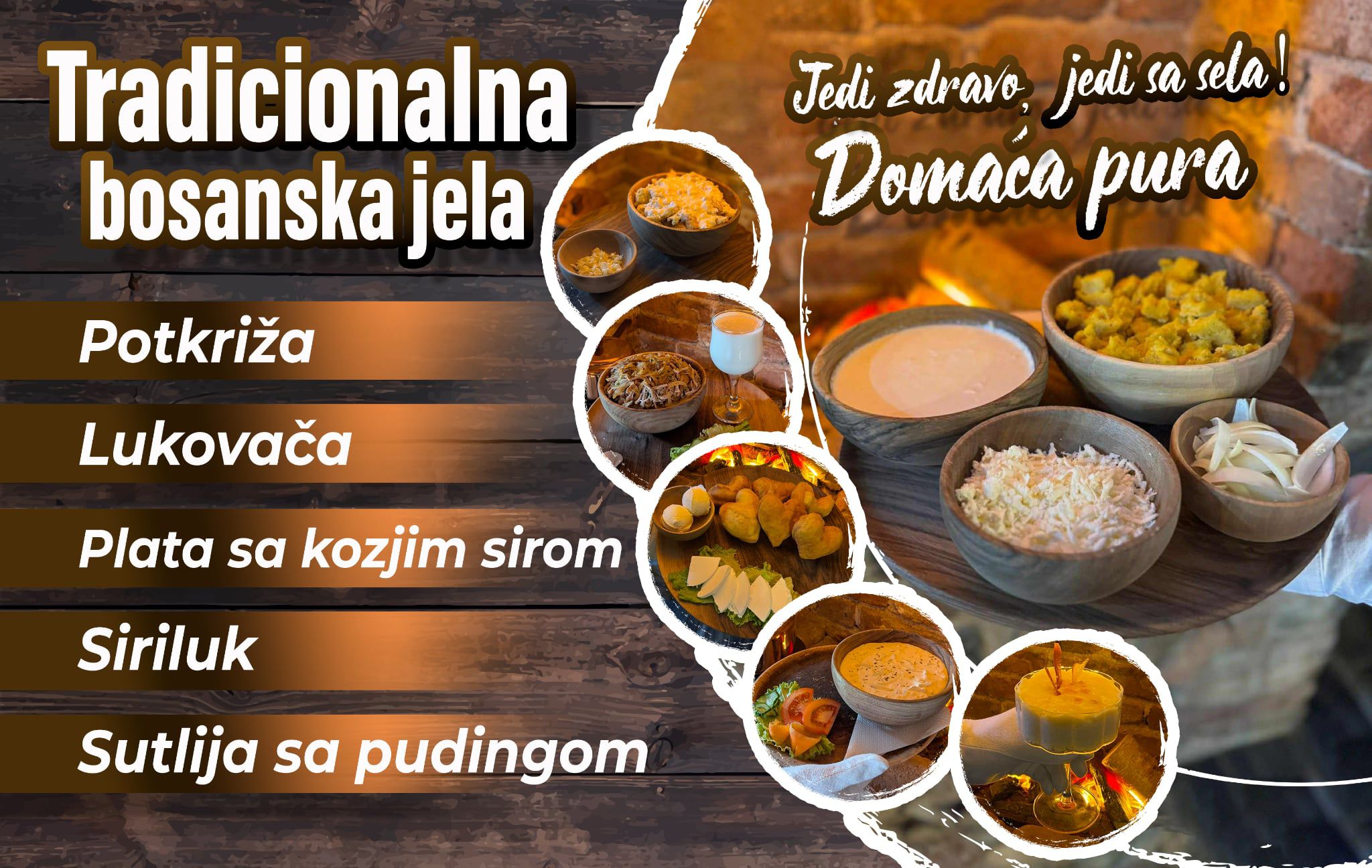 Na trpezi vas očekuju pravi domaći specijaliteti – ukusna pura, sočna potkriža, domaća lukovača i brojna druga jela pripremljena po tradicionalnim receptima. Svaki zalogaj odiše kvalitetom domaćih sastojaka i pažljivo pripremljenom hranom koja podsjeća na bakinu kuhinju.